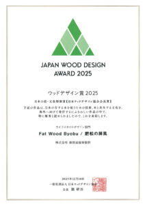 弊社の作品が、「 JAPAN WOOD DESIGN AWARD 2025 / ウッドデザイン賞 2025 」にて、上位賞となる「 日本の技・文化特別賞 / 日本ウッドデザイン協会会長賞( 会長:建築家 隈研吾 ) 」を受賞いたしました。