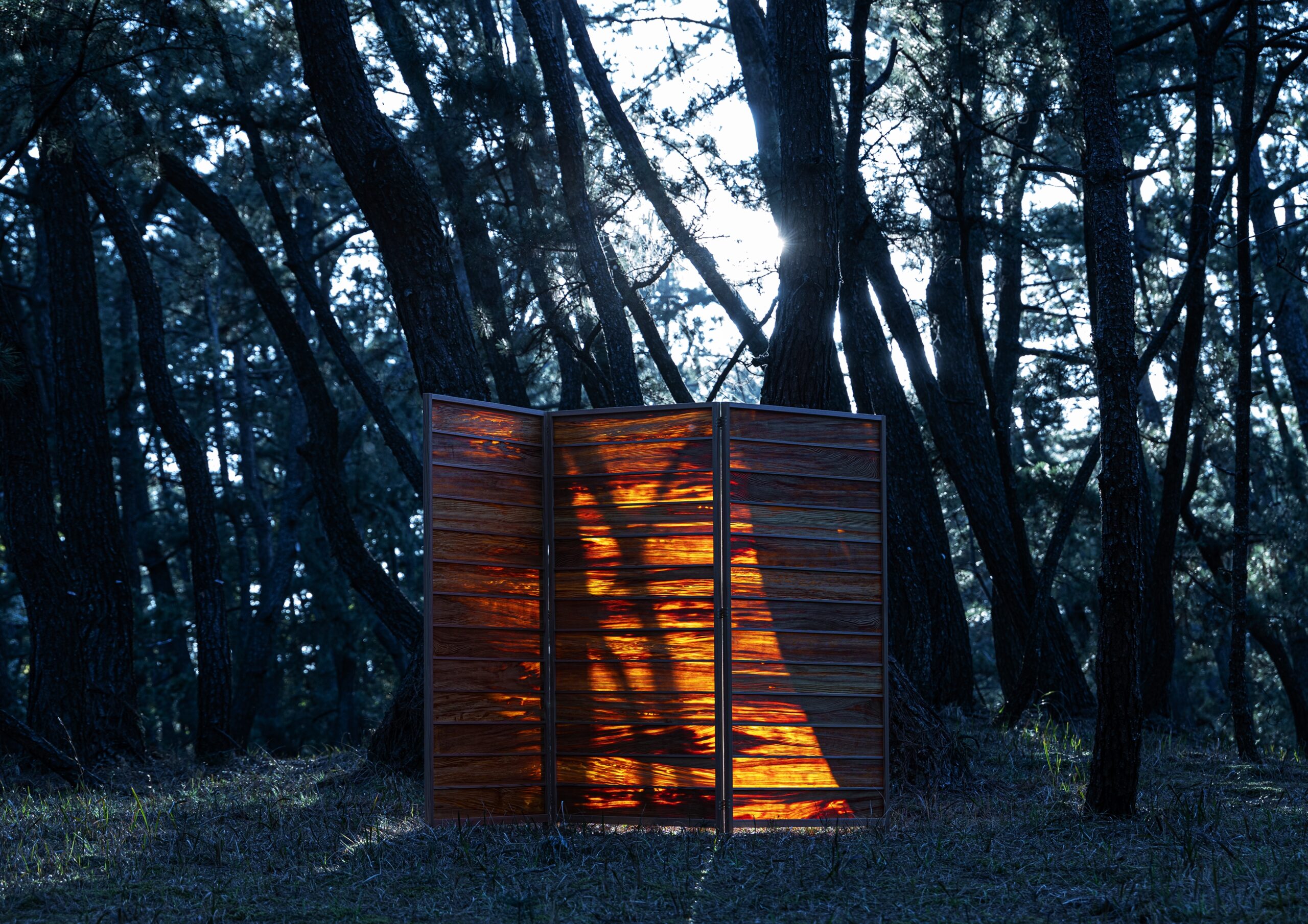 ヤニ/樹脂を多く含んだ肥松を用いた屏風を制作した。屏風は平安時代より発展をとげてきた日本の伝統的な家具である。字のごとく風を遮り、視線を遮り、空間を仕切る間仕切の役割をもつ。肥松は樹齢数百年を超える樹脂を多く含んだ松から採取できる貴重な材である。長い年月をかけ蓄積された松の脂は、光を捉えると赤い色を放つ。この独特な色こそ肥松の樹脂の色である。この材と屏風を組合わせて、肥松の屏風をつくる。光を捉えて、肥松の屏風が赤く妖艶に光り出す。また、この屏風は、特殊なジョイントにより、様々な形へと変化することで、その機能が装飾的な壁や照明器具に変化する。樹脂が多く、使用方法やメンテナンスに困り、昔から毛嫌いされてきた松ヤニを様々な加工技術によって、美しい素材に変えて、先進的なデザインに昇華する。