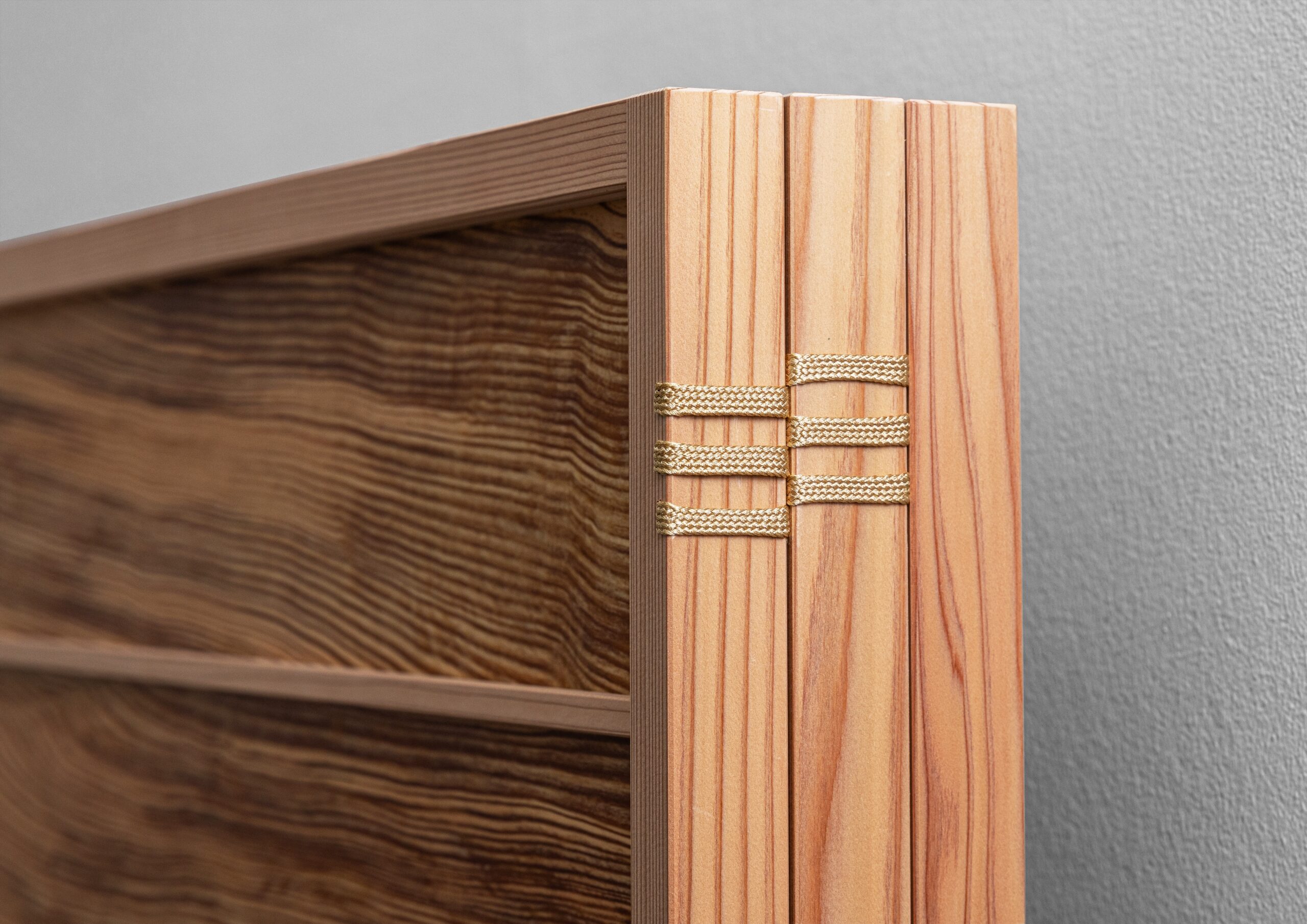 By using special joints called " string hinges " to connect the panels, Fat Wood Byobu can be transformed into various shapes.