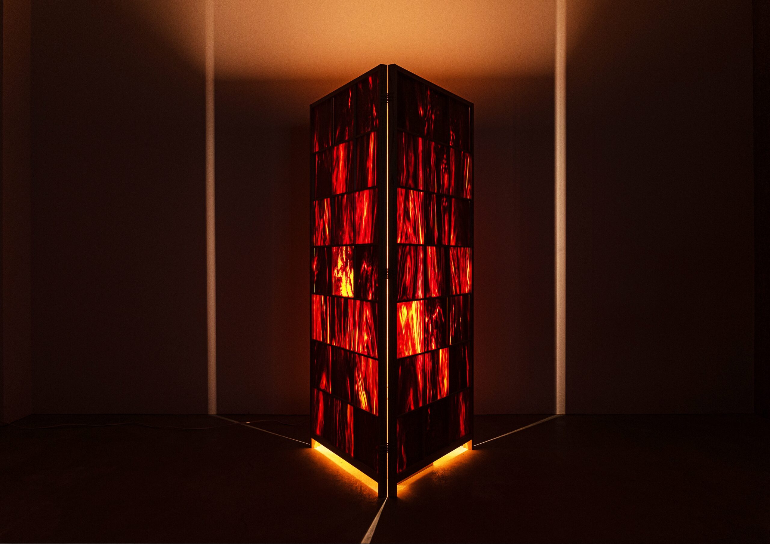 Byobu changes shape and transforms into a lighting fixture. Huge floor lamp glows a bewitching red in various spaces.