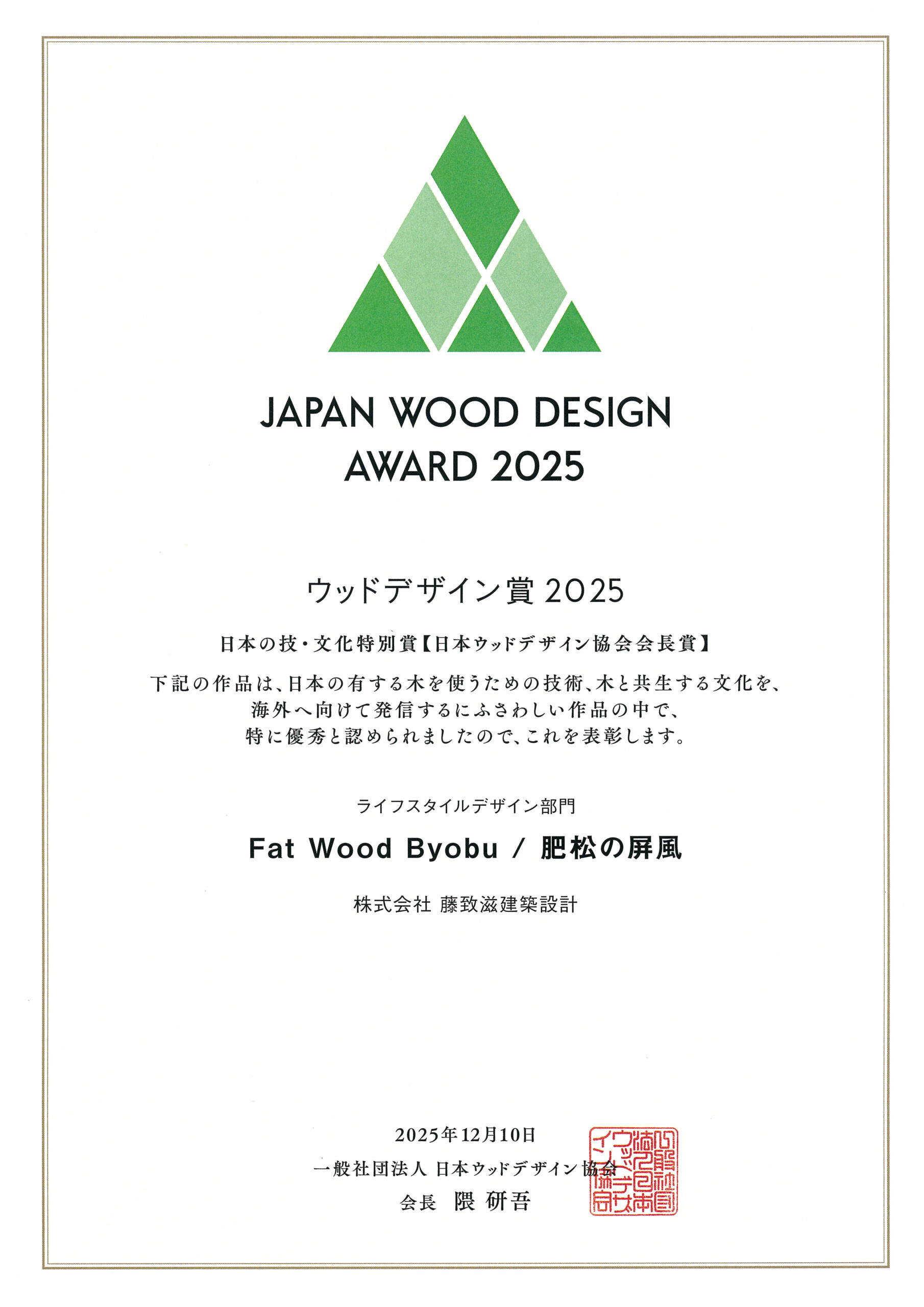 JAPAN WOOD DESIGN AWARD 2025 日本の技・文化特別賞 / 日本ウッドデザイン協会会長賞( 会長:建築家 隈研吾 )受賞 (Japan)